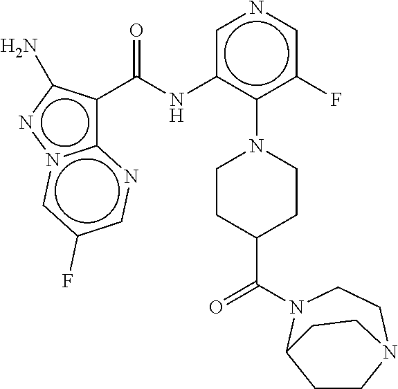 - HHPRZGCDEMIRLQ-UHFFFAOYSA-N CN1CCN(C(=O)C2CCN(c3c(F)cncc3NC(=O)c3c(N)nn4cc(F)cnc34)CC2)CC1 Chemical compound CN1CCN(C(=O)C2CCN(c3c(F)cncc3NC(=O)c3c(N)nn4cc(F)cnc34)CC2)CC1 HHPRZGCDEMIRLQ-UHFFFAOYSA-N 0.000 description 4