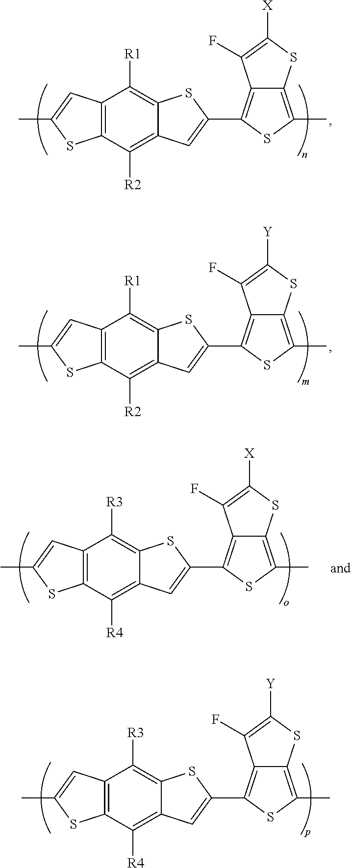 10 where R9 and R10 are independently selected from the group consisting of H, alkyl group, alkoxy group, aryl groups. Additionally in this process the polymerization of f, g, h and i are selected from stille coupling, suzuki coupling, a nickel catalyzed reaction or direct arylation.