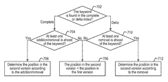 In response to a negative check result at step 704 (i.e., there is no addition or removal located in the first version in front of the found keyword), the position of the found keyword in the second version is determined as the position of the found keyword in the first version at step 706. On the other hand, in response to a positive check result at step 704 (i.e., there is at least one addition or removal whose position is smaller than the position of the found keyword in the first version), the position of the found keyword in the second version is determined in accordance with the at least one addition or removal at step 708. For instance, for each addition, one is added to the position of the found keyword in the first version. Further, for each removal, one is subtracted from the position of the found keyword in the first version. As a result, the position of the found keyword in the second version equals to the position of the found keyword in the first version plus the number of the additions minus the number of the removals.
