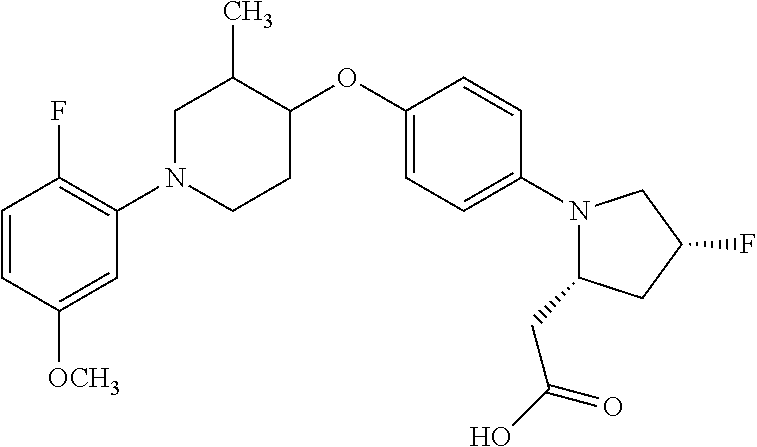 Example 168 (off-white solid, 1.7 mg) was isolated as a single isomer as a byproduct during the preparation of Example 159. LC-MS Anal. Calc'd for C25H32ClFN4O5: 522.21, found [M+H] 523.3. 1H NMR (400 MHz, CDCl3) δ 7.96 (br. s, 1H), 7.34 (d, J=18.9 Hz, 1H), 6.83 (d, J=12.1 Hz, 1H), 6.27 (br. s, 1H), 4.77 (d, J=3.7 Hz, 1H), 4.21 (t, J=7.3 Hz, 1H), 3.89 (s, 3H), 3.76-3.65 (m, 2H), 3.56 (d, J=11.9 Hz, 2H), 3.42 (s, 3H), 3.13-3.03 (m, 1H), 2.93 (t, J=10.7 Hz, 1H), 2.70-2.59 (m, 2H), 2.55-2.38 (m, 2H), 2.27 (d, J=13.0 Hz, 2H), 1.84 (d, J=10.6 Hz, 1H), 1.13 (d, J=7.0 Hz, 3H), 1.08 (d, J=6.6 Hz, 3H). Analytical HPLC(ZORBAX®, 50% B start): RT=6.7 min, HI: 94.0%. hGPR40 EC50=500 nM.