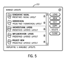 As an example, and with reference to FIG. 3, the visualization tool 102 may present to the user (via the user interface 120) a pulldown menu 250 listing predefined and custom layout options and the option to manage these layouts. Turning to FIG. 5, a Manage Layouts window 252 is presented to the user when the Manage Layouts option is selected in menu 250. In window, 252, the user may select (and edit) any of the predefined layouts or may opt to establish a new custom layout, including defining a new set of layers and associated rules. In this example, three predefined layered layouts are presented to the user: Architectural Layers, Implementation Layers and Project View. In the example shown, selection of the Architectural Layers layout for editing leads to an Edit Layout window 254 that displays the set of layers (e.g., Application Layer, Process Layer, Service Layer, Infrastructure Layer, etc.) corresponding to the layout, enables the user to define rules for each layer, add, delete and rename layers, etc. To establish rules for a particular layer, the user may expand the layer (e.g., Application Layer 256) in the Edit Layout window and 254 then select the Artifact button 258 to display a pull-down menu 260 (FIG. 7) that can be used to select the type(s) of entities (i.e., Artifacts) that belong to the layer. Types of entities may include, for example, Application, Assertion, Birt Report, Business Process, Contact, Service, etc.