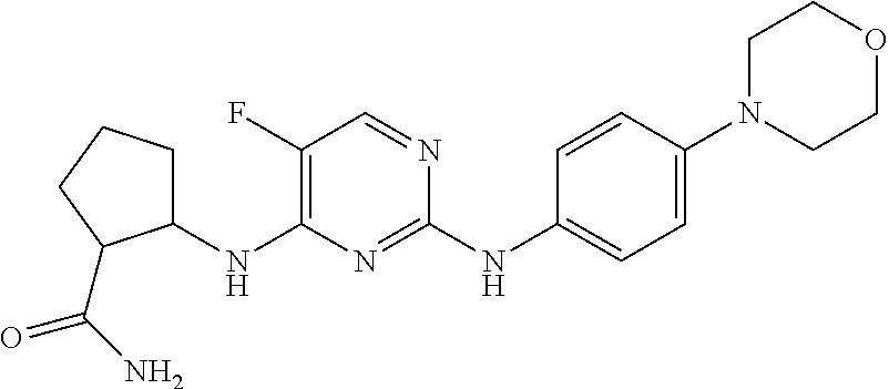 - NXPWWEHALTTZNT-UHFFFAOYSA-N CN1CCN(C2=CC=CC(NC3=NC=C(F)C(NC4CCCC4C(N)=O)=N3)=C2)CC1 Chemical compound CN1CCN(C2=CC=CC(NC3=NC=C(F)C(NC4CCCC4C(N)=O)=N3)=C2)CC1 NXPWWEHALTTZNT-UHFFFAOYSA-N 0.000 description 1