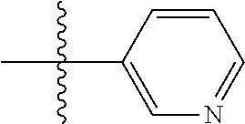 - wherein said heteroaryl or aryl groups are optionally substituted with one or more substituents selected from the group consisting of halogen, C1-7 alkyl, C2-7 alkenyl, C2-7 alkynyl, halo C1-7 alkyl, nitro, hydroxyl, sulfhydryl, amino, C1-7 alkoxy, C3-10 cycloalkoxy, aryloxy, arylalkyloxy, oxyheterocyclic, heterocyclic-substituted alkyloxy, thio C1-7 alkyl, thio C3-10 cycloalkyl, thioaryl, thio-heterocyclic, arylalkylthio, heterocyclic-substituted alkylthio, formyl, carbamoyl, thiocarbamoyl, ureido, thioureido, sulfonamido, hydroxylamino, alkoxy-amino, mercaptoamino, thioalkylamino, acylamino, thioacylamino, cyano, carboxylic acid or esters or thioesters or halides or anhydrides or amides thereof, thiocarboxylic acid or esters or thioesters or halides or anhydrides or amides thereof, alkylamino, cycloalkylamino, alkenylamino, cyclo-alkenylamino, alkynylamino, arylamino, arylalkylamino, hydroxyalkylamino, mercaptoalkylamino, heterocyclic amino; and