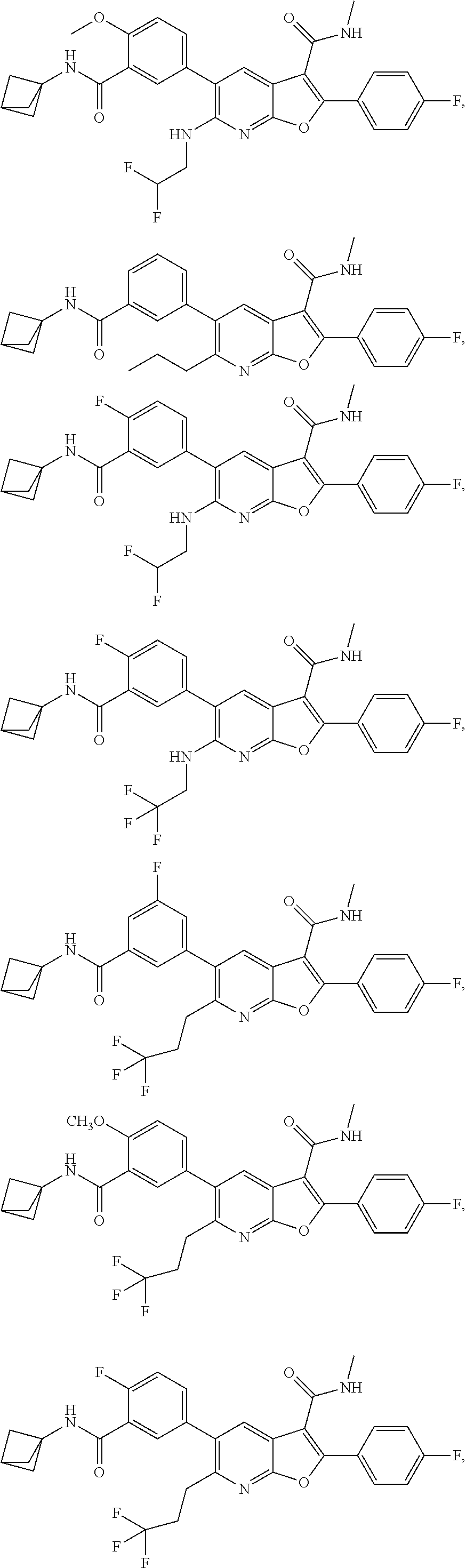 Triflic acid (182 μl, 2.06 mmol) was added to a stirring solution of 6-(benzylamino)-5-(3-(bicyclo[1.1.1]pentan-1-ylcarbamoyl)phenyl)-2-(4-fluorophenyl)-N-methylfuro[2,3-b]pyridine-3-carboxamide (96 mg, 0.17 mmol) in DCM (6.8 mL) at rt. After 1 h, the reaction was concentrated and loaded onto a silica column and was purified on silica gel (Biotage, MeOH/DCM gradient, fraction collection at λ=254 nm) to give the desired product still in crude form, which was subsequently purified by preparative reverse phase HPLC on a C18 column using a suitably buffered H2O/CH3CN gradient, and concentrated to give the expected product 6-amino-5-(3-(bicyclo[1.1.1]pentan-1-ylcarbamoyl)phenyl)-2-(4-fluorophenyl)-N-methylfuro[2,3-b]pyridine-3-carboxamide (40 mg, 0.085 mmol, 50% yield) consistent by LCMS and NMR.