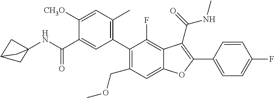 To evaluate compound efficacy, titrated compounds were transferred to sterile 384-well tissue culture treated plates, and the plates were seeded with HCV replicon cells (50 μt at a density of 2.4×103 cells/well) in DMEM containing 4% FBS (final DMSO concentration at 0.5%). After 3 days incubation at 37° C., cells were analyzed for Renilla Luciferase activity using the EnduRen substrate (Promega cat #E6485) according to the manufacturer's directions. Briefly, the EnduRen substrate was diluted in DMEM and then added to the plates to a final concentration of 7.5 μM. The plates were incubated for at least 1 h at 37° C. then read on a Viewlux Imager (PerkinElmer) using a luminescence program. The 50% effective concentration (EC50) was calculated using using the four-parameter logistic formula noted above.