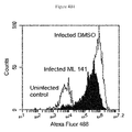 FIG. 4B1 illustrates by histogram overlay how ML 141 inhibits host cell invasion. Human umbilical vein endothelial cells (HUVEC) were pretreated (18 hours) with the vehicle control dimethyl sulfoxide (DMSO) or ML 141 (10 μM) suspended in dimethyl sulfoxide (DMSO). Following infection by Alexa Fluor 488-labeled Staphylococcus aureus (1 hour), extracellular bacteria were removed using the antimicrobials gentamicin and lysostaphin. Infected cells (identified by 488 fluorescence) were detected by flow cytometry and represented by histogram overlay.