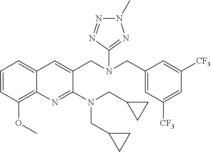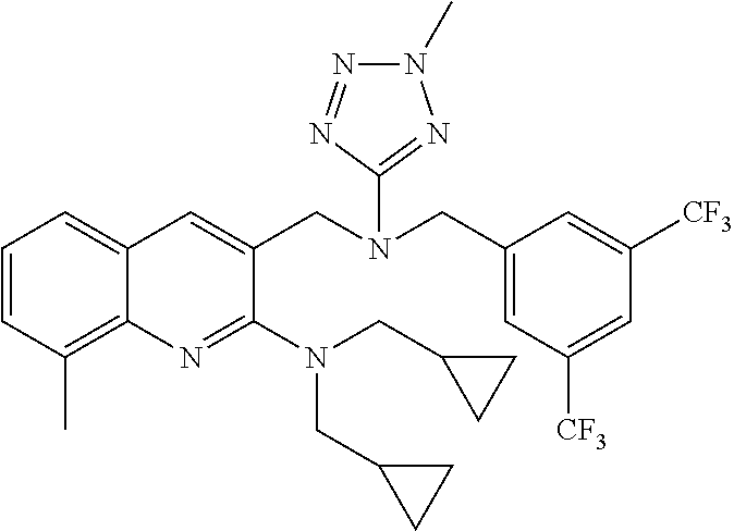 - LOXFXVBFMFGQTQ-UHFFFAOYSA-N CCN(CC1CCCC1)C1=NC2=CC=CC=C2C=C1CN(CC1=CC(C(F)(F)F)=CC(C(F)(F)F)=C1)CC1=NN=NN1 Chemical compound CCN(CC1CCCC1)C1=NC2=CC=CC=C2C=C1CN(CC1=CC(C(F)(F)F)=CC(C(F)(F)F)=C1)CC1=NN=NN1 LOXFXVBFMFGQTQ-UHFFFAOYSA-N 0.000 description 2