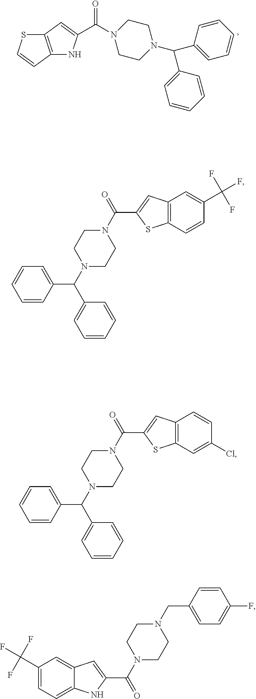In one embodiment is a compound of Formula (VI) wherein X is —CH2—. In another embodiment is a compound of Formula (VI) wherein X is —C(═O)—. In another embodiment is a compound of Formula (V) or (VI) wherein R3 is H. In another embodiment is a compound of Formula (V) or (VI) wherein R3 is —CH3. In another embodiment is a compound of Formula (III), (IV), (V), or (VI) wherein each R1 is independently F, Cl, Br, I, —CN, —NR4R5, —NO2, —OH, —CF3, —OCF3, —OC1-C6alkyl, or C1-C6alkyl. In another embodiment is a compound of Formula (III), (IV), (V), or (VI) wherein each R1 is independently F, Cl, Br, —CF3, —OC1-C6alkyl, or C1-C6alkyl. In another embodiment is a compound of Formula (III), (IV), (V), or (VI) wherein each R2 is independently F, Cl, Br, I, —CN, —NR4R5, —NO2, —OH, —CF3, —OCF3, —OC1-C6alkyl, or C1-C6alkyl. In another embodiment is a compound of Formula (III), (IV), (V), or (VI) wherein each R2 is independently F, Cl, Br, —CF3, —OC1-C6alkyl, or C1-C6alkyl. In another embodiment is a compound of Formula (I) or Formula (II) wherein R2 is F, Cl, Br, —CF3, —CH3, or —OCH3. In another embodiment is a compound of Formula (III), (IV), (V), or (VI) wherein n is 1 and m is 0. In another embodiment is a compound of Formula (III), (IV), (V), or (VI) wherein n is 1 and m is 1. In another embodiment is a compound of Formula (III), (IV), (V), or (VI) wherein n is 1 and m is 2. In another embodiment is a compound of Formula (III), (IV), (V), or (VI) wherein n is 2 and m is 1. In another embodiment is a compound of Formula (III), (IV), (V), or (VI) wherein n is 0 and m is 0.