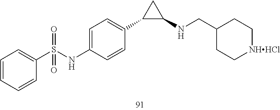 The LSD-1 luminescence assay is performed in a buffer containing 25 mM Tris, pH 7.5, 50 mM potassium chloride, 0.02% heat-denatured BSA, 2 mM CHAPS and milliQ ultrapure water. An enzyme solution containing 30 nM LSD-1 (in-house prep) is prepared in this buffer, as well as a substrate solution containing 30 uM histone H3K4 dimethylated peptide (H-ART[K-Me2]QTARKSTGGKAPRKQLAGG-OH, commercial source). Two microliters of enzyme solution are added to each well of a white Greiner low volume 384 well plate (cat#784075), into which 50 nL of 100% DMSO dilution of test compound has been dispensed. The enzyme and test compound are allowed to incubate together for 30 minutes at room temperature. Two microliters of the substrate mix are then added to each well of the plate to initiate the reaction. The plates are covered, protected from light and allowed to incubate for two hours at room temperature. Then, 4 uL of HyPerBlu peroxide detection luminescence reagent (Lumigen/Beckman Coulter, cat# HPB-00005) is added to each well to quench the demethylase reaction and generate the peroxide-dependent luminescence signal. The plates are then incubated for 15-30 minutes in the dark at room temperature prior to being read for Luminescence using a Perkin Elmer Viewlux plate reader. Percent inhibition is calculated based on no compound and no enzyme controls, and inhibition curves are then plotted to determine PIC50 values.