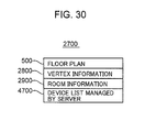 FIG. 67 is a diagram showing the configuration of the home information 2700 for a case where the floor plan 5200 shown in FIG. 52 is adopted. As shown in FIG. 67, the home information 6400 includes the floor plan 5200, the room information 6800, and the device list 4700 managed by the server. In the floor plan 5200, the display positions of the rooms are determined in advance. Therefore, the vertex information 2800 included in the home information 2700 is omitted from the home information 6400.