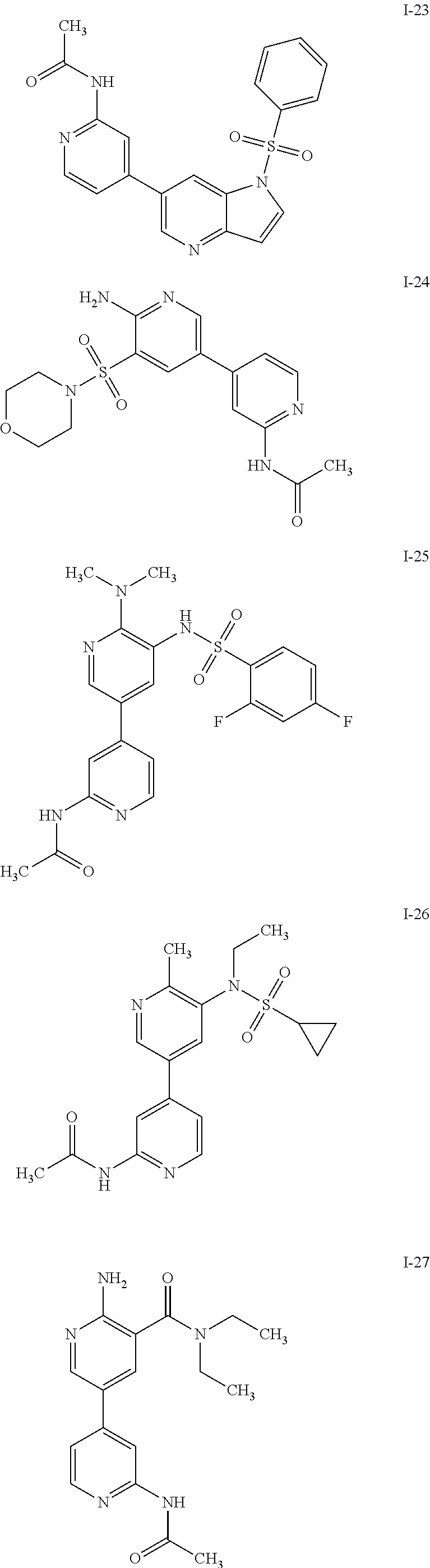 Tumor growth was monitored with vernier calipers. The mean tumor volume was calculated using the formula V=W2×L/2. When the mean tumor volume reached approximately 150-200 mm3, the animals were randomized into treatment groups. See Tables 39, 40, and 41 below. Test compounds (either compounds of formula I such as I-41, other therapeutic agents such as erlotinib, or combination thereof), and vehicle control were administered by oral gavage as described in the tables below. The vehicle was 3.5% w/v NaHCO3 in water or 100% PEG400. Tumor growth was measured twice per week. See also FIGS. 1-6.