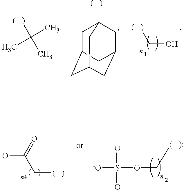 - n1, n2 and n3 are independently 2-3, and n4 is 1-2; and wherein ( ) is the point of attachment of the R1, R2, R3, R4 or R5 group to the ring structure.