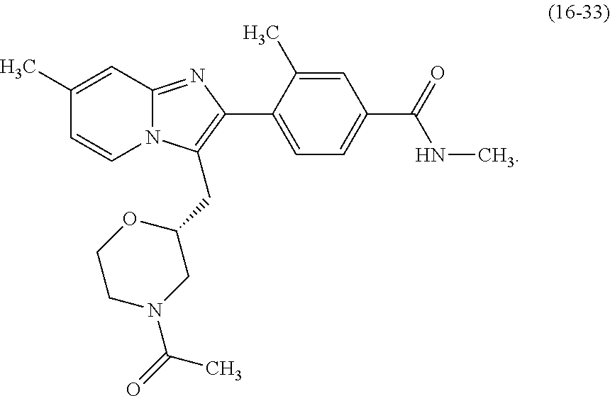 - CIJNCPNDNHPVBB-UJSUIUMNSA-N CNC(=O)C1=CC(C)=C(C2=C(CC3CCN(C(=O)OC)C3)N3C=CC(C)=CC3=N2)C=C1.CNC(=O)C1=CC(C)=C(C2=C(C[C@H]3CN(C(C)=O)CCO3)N3C=C(F)C(C)=CC3=N2)C=C1.CNC(=O)C1=CC=C(C2=C(CC3CC(C)N(C(C)=O)C3)N3C=CC(C)=CC3=N2)C(C)=C1.CNC(=O)C1=CC=C(C2=C(C[C@H]3CN(C(C)=O)[C@H](C)CO3)N3C=CC(C)=CC3=N2)C(C)=C1 Chemical compound CNC(=O)C1=CC(C)=C(C2=C(CC3CCN(C(=O)OC)C3)N3C=CC(C)=CC3=N2)C=C1.CNC(=O)C1=CC(C)=C(C2=C(C[C@H]3CN(C(C)=O)CCO3)N3C=C(F)C(C)=CC3=N2)C=C1.CNC(=O)C1=CC=C(C2=C(CC3CC(C)N(C(C)=O)C3)N3C=CC(C)=CC3=N2)C(C)=C1.CNC(=O)C1=CC=C(C2=C(C[C@H]3CN(C(C)=O)[C@H](C)CO3)N3C=CC(C)=CC3=N2)C(C)=C1 CIJNCPNDNHPVBB-UJSUIUMNSA-N 0.000 description 1