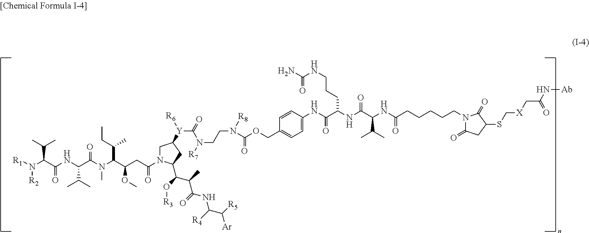 U.S. Pat. No. 6,214,345 discloses an ADC in which a cytotoxic drug, such as doxorubicin, Taxol, etc., is coupled to an antibody via an enzyme-cleavable peptide linker that can be cleaved by the lysosomal protease cathepsin. Also, U.S. Pat. No. 7, 964,566 discloses an ADC in which a cytotoxic drug, such as MeVal-Val-Dil-Dap-norephedrine (MMAE) and MeVal-Val-Dil-Dap-Phe (MMAF), is attached to an antibody through an enzyme-cleavable peptide linker.