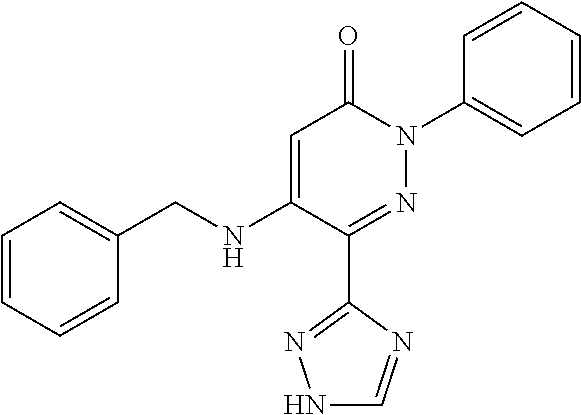5-Benzylamino-2-phenyl-6-(1H-1,2,4-triazol-3-yl)-3(2H)-pyridazinone: A mixture of 5-phenoxy-2-phenyl-6-(1H-1,2,4-triazol-3-yl)-3(2H)-pyridazinone (100 mg, 0.3 mmol) and benzylamine (200 mg, 1.9 mmol) was stirred at 200° C. for 30 min under N2 atmosphere. The oily mixture was cooled down to room temperature, and was crystallized on treatment with Et2O (20 mL). The solid product was filtered off, washed with Et2O (2×20 ml) and dissolved in EtOAc (100 mL). The solution was washed successively with 5% aqueous AcOH (3×30 mL) and water (3×30 mL). The organic phase was dried (Na2SO4) and evaporated. The crude product was recrystallized from a mixture of iPr2O and EtOAc to yield the title compound as a white crystalline substance (78 mg, 75%). Mp 192-193° C., 1H NMR (400 MHz, DMSO-d6) □ 4.54 (d, 2H, J=5.6 Hz, CH2), 5.80 (s, 1H, H-5), 7.28-7.72 (m, 10H, 2×C6H5), 8.24 (br s, 1H) 8.86 (br s, 1H), 14.70 (br s, 1H) ppm.