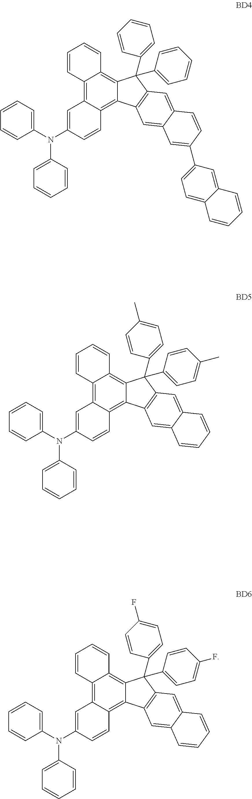 For the manufacture of an anode, an ITO glass substrate of 15 Ω/cm2 (500 Å) from Corning Co. was used. The ITO glass substrate was cut into a 50 mm×50 mm×0.5 mm size, ultrasonically washed using isopropyl alcohol and pure water for 10 minutes, respectively, exposed to ultraviolet radiation for 10 minutes, and exposed to ozone for washing. After installing the substrate in a vacuum deposition apparatus, 2-TNATA was vacuum deposited on the glass substrate with the anode formed thereon to a thickness of about 600 Å to form a hole injection layer. On the hole injection layer, NPB was vacuum deposited to a thickness of about 300 Å to from a hole transport layer. Then, MADN and 5 wt % of Compound BD1 were vacuum deposited to a thickness of about 300 Å to form an emission layer. On the emission layer, the material for the electron transport layer (Compound ET1) was vacuum deposited to a thickness of about 300 Å to form an electron transport layer. On the electron transport layer, 10 Å of LiF (an electron injection layer) and 2,000 Å of Al (a cathode) were subsequently vacuum deposited to manufacture an organic light emitting device.