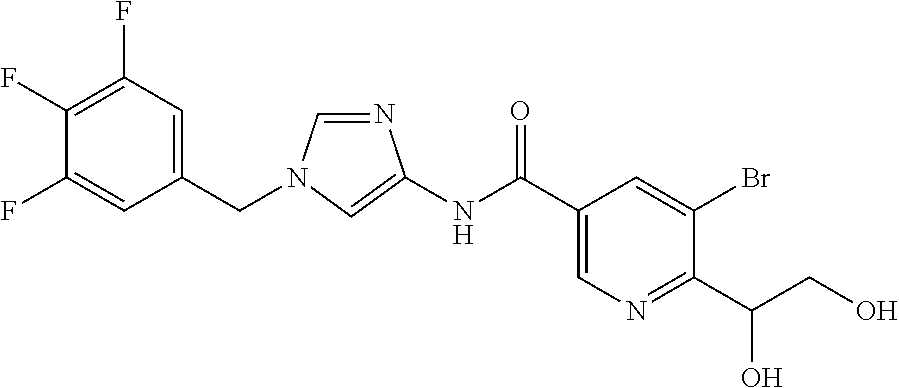 - LBDFHGWTCCABQD-UHFFFAOYSA-N O=C(NC1=CN(CC2=CC(F)=C(F)C(F)=C2)C=N1)C1=CN=C(CO)C(C(F)F)=C1 Chemical compound O=C(NC1=CN(CC2=CC(F)=C(F)C(F)=C2)C=N1)C1=CN=C(CO)C(C(F)F)=C1 LBDFHGWTCCABQD-UHFFFAOYSA-N 0.000 description 3