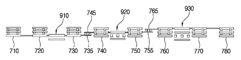 In this manner, the current from first pad 710 to eighth pad 780 may generate a potential difference between the two ends of each of first, second, and third test elements 910, 920, and 930. The voltage drop between the two ends of each of first, second, and third test elements 910, 920, and 930 may be respectively measured by second and third pads 720 and 730, fourth and fifth pads 740 and 750, and sixth and seventh pads 760 and 770. In this manner, the resistance of each of first, second, and third test elements 910, 920, and 930 may be calculated based on the measured voltage and current. It is noted that, however, relative configurational arrangements of first, second, third, and fourth wires 735, 745, 755, and 765 may be varied. For example, first and fourth wires 735 and 765 may be disposed on the same layer different from the layer on which second and third wires 745 and 755 are disposed.