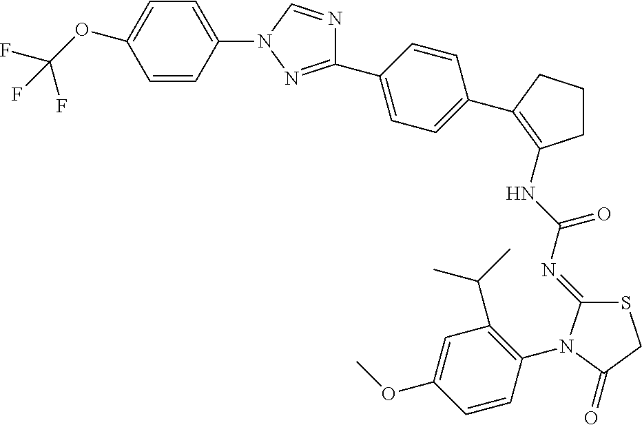 An alternative method for preparing analogs having the general structure 3-1′ (Scheme 3) is described in Scheme 3a, Intermediate 2-iminolthiazolidin-4-one (3-1a, step a) is reacted directly with an isocyanate (1-2), in the presence of about 0.1 to about 2 equivalents of an inorganic base such as cesium carbonate or sodium hydride to form cyclized thiobiuret (3-1′). The reaction can be performed at temperatures from about 0° C. to about 100° C., preferably from about 20° C. to about 80° C., in an aprotic solvent or solvent mixture chosen from acetonitrile, acetone, toluene, tetrahydrofuran, 1,2-dichloroethane, dichloromethane, or mixtures thereof, but use of acetonitrile is preferred.