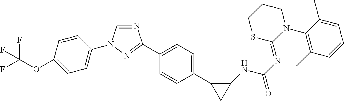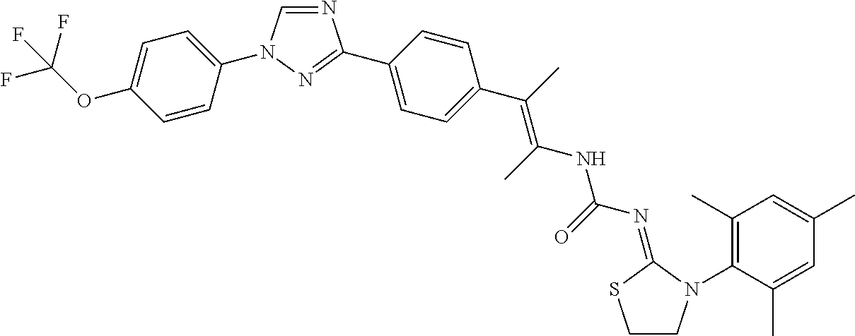 Alternatively, the isocyanates may be generated via a Curtius rearrangement of an acyl azide, Ar1-Het-Ar2-L-C(O)N3 (1-4), which is, in turn, prepared from the corresponding carboxylic acid precursor, Ar1-Het-Ar2-L-CO2H (1-3). Formation of an acyl azide (Scheme 1, step b) occurs either by treatment of the acid with ethyl chloroformate and sodium azide in the presence of an amine base such as triethylamine, or with diphenylphosphoryl azide in the presence of an amine base such as triethylamine. The acyl azide is then made to undergo a Curtius rearrangement (which may need to be thermally induced), leading to the corresponding isocyanate (1-3). Depending on the nature of the particular acyl azide, this rearrangement may occur spontaneously at ambient temperature, or it may require heating from about 40° C. to about 100° C. in a suitable solvent, such as toluene, or acetonitrile, or an ethereal solvent such as dioxane or tetrahydrofuran. Azides of arylacetic acids are known, though frequently, due to their reactivity, they are not isolated as pure solids. Accordingly, the acyl azide intermediate is not always fully characterized, but may simply be heated directly without characterization, to generate the isocyanate.