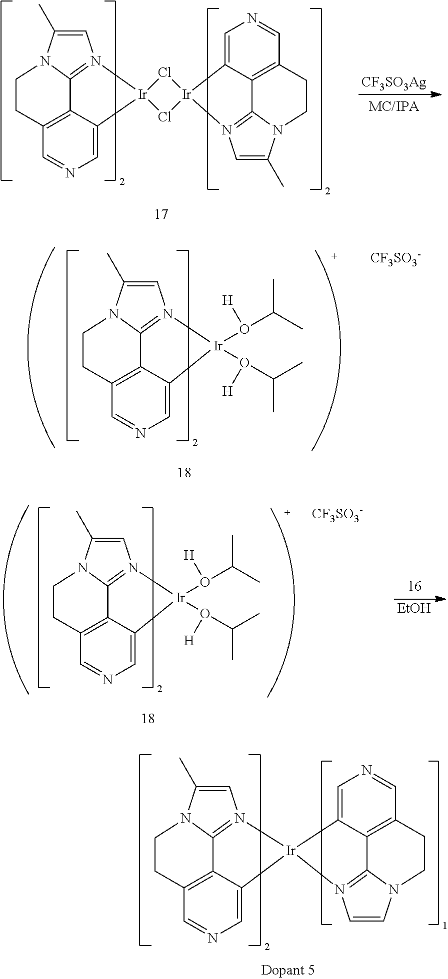 12 g (0.010 mmol) of the intermediate compound-17 was dissolved in MC in a round-bottomed flask. Subsequently, a solution obtained by dissolving 5.7 g (0.022 mmol) of silver trifluoro methanesulfonate in isopropylalcohol was added thereto in a dropwise fashion. The mixture was stirred at room temperature for one day, obtaining an intermediate compound-18, and the intermediate compound-18 was used in the following reaction without purification.