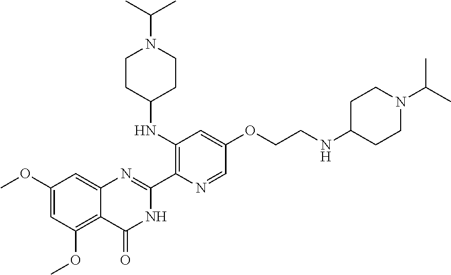 MV4-11 cells: 96-well plates were seeded with 5×104 cells per well of exponentially growing human AML MV-4-11 (CRL-9591) cells and immediately treated with two-fold dilutions of test compounds, ranging from 30 μM to 0.2 μM. Triplicate wells were used for each concentration, as well as a media only and three DMSO control wells. The cells and compounds were incubated at 37° C., 5% CO2 for 72 h before adding 20 μl of the CellTiter Aqueous One Solution (Promega) to each well and incubating at 37° C., 5% CO2 for an additional 3-4 h. The absorbance was taken at 490 nm in a spectrophotometer and the percentage of proliferation relative to DMSO-treated cells was calculated after correction from the blank well. IC50 were calculated using the GraphPad Prism software.