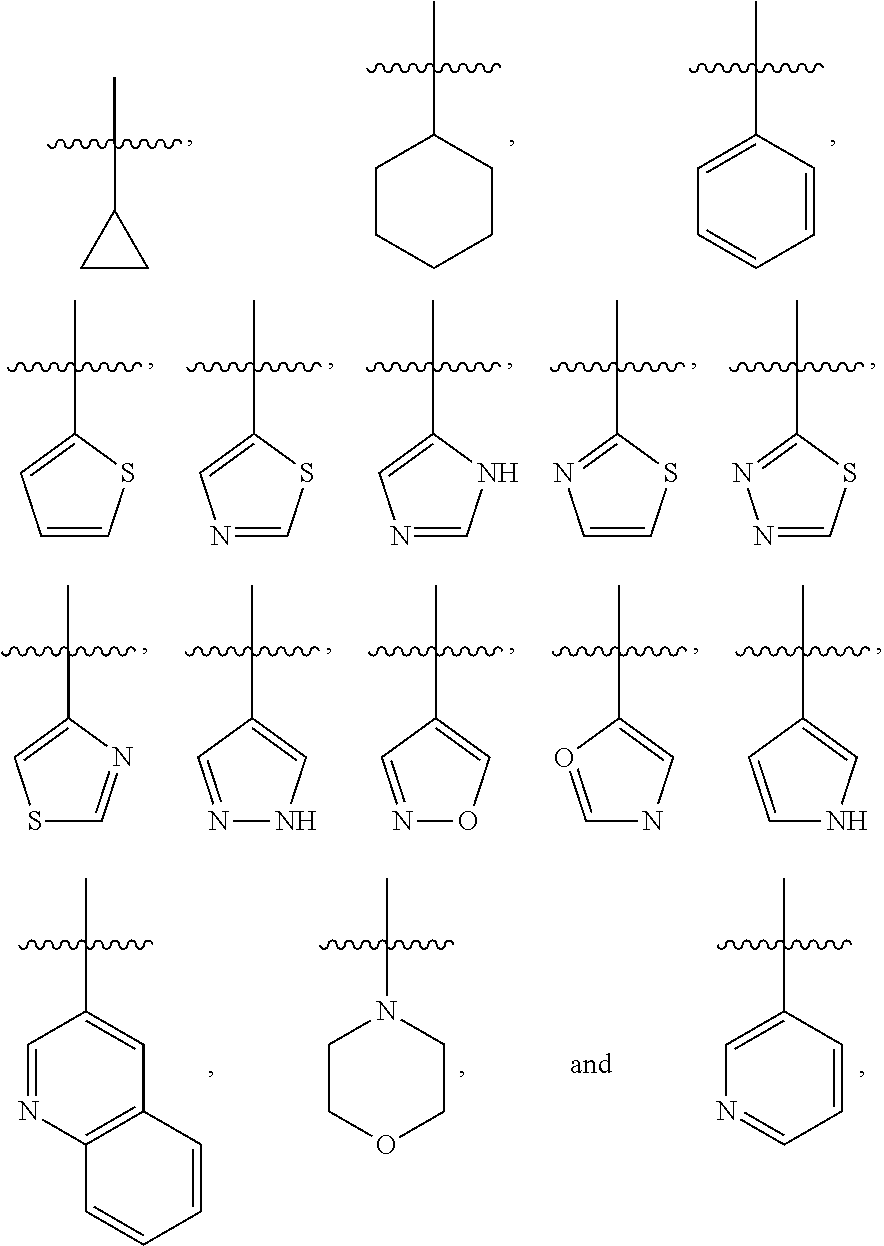 C1-10 alkyl or heteroalkyl, C3-10 cyclohydrocarbyl or heterocyclohydrocarbyl, and C1-10 alkyl or heteroalkyl wherein said C1-10 alkyl or heteroalkyl is substituted with C3-10 cyclohydrocarbyl or heterocyclohydrocarbyl, include, but not limited to: