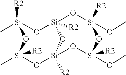 A silsesquioxane is an organosilicon compound 3. In certain embodiments, R2 is alkyl. In other embodiments, R2 is alkyl with an amino moiety. In yet other embodiments, R2 is alkyl with an chlorine moiety. In still other embodiments, R2 is alkyl with a quaternary ammonium group.