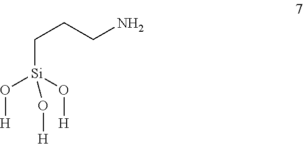 In certain embodiments, Applicants' organosilane comprises a trihydroxy silane 2. In certain embodiments, R2 is alkyl. In other embodiments R2 is alkyl with an amino moiety. In still other embodiments, R2 comprises a quaternary ammonium group. In still other embodiments, comprises a chlorine moiety. In still other embodiments, R2 is —OH.