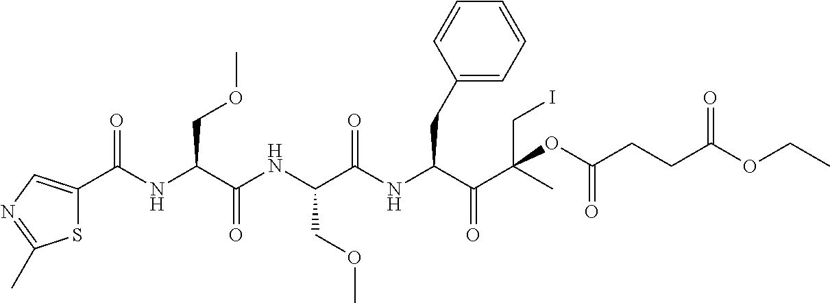 FIG. 1 is a scheme showing cleavage of an embodiment of an epoxy ketone protease inhibitor by peptidases and epoxide hydrolase to inactive metabolites.