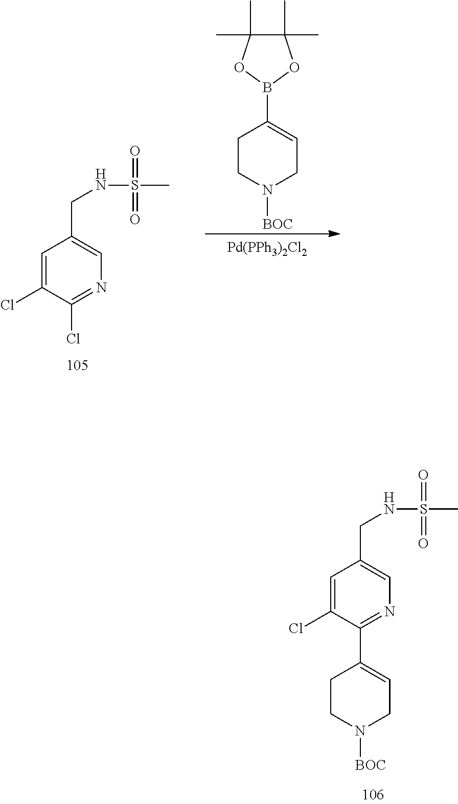 - GZLQBWMDIZKQQM-UHFFFAOYSA-L C1=CC=C(P(C2=CC=CC=C2)C2=CC=CC=C2)C=C1.C1=CC=C(P(C2=CC=CC=C2)C2=CC=CC=C2)C=C1.CC(C)(C)OC(=O)N1CC=C(B2OC(C)(C)C(C)(C)O2)CC1.CC(C)(C)OC(=O)N1CC=C(C2=NC=C(CC#N)C=C2Cl)CC1.N#CCC1=CN=C(Cl)C(Cl)=C1.O=C(OO)[Pd]([Na])([Na])(Cl)Cl Chemical compound C1=CC=C(P(C2=CC=CC=C2)C2=CC=CC=C2)C=C1.C1=CC=C(P(C2=CC=CC=C2)C2=CC=CC=C2)C=C1.CC(C)(C)OC(=O)N1CC=C(B2OC(C)(C)C(C)(C)O2)CC1.CC(C)(C)OC(=O)N1CC=C(C2=NC=C(CC#N)C=C2Cl)CC1.N#CCC1=CN=C(Cl)C(Cl)=C1.O=C(OO)[Pd]([Na])([Na])(Cl)Cl GZLQBWMDIZKQQM-UHFFFAOYSA-L 0.000 description 1
