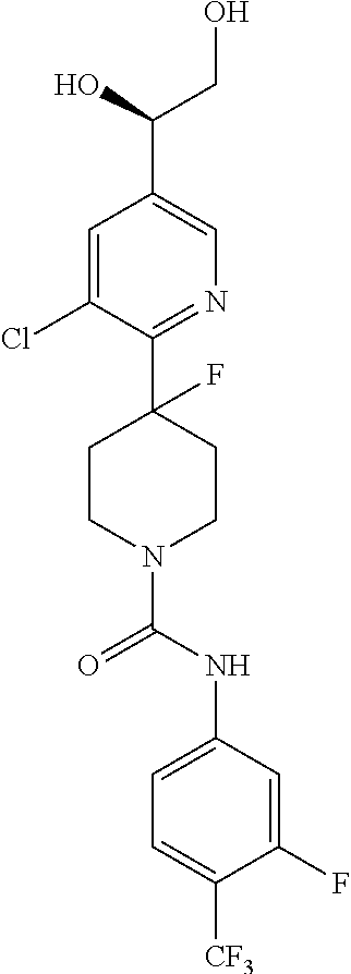 - GKIYNFUKAJFNNT-AQQWARRFSA-N C=S(=O)(C1=CC=C(NC(=O)N2CCC(F)(C3=NC=C([C@H](O)CO)C=C3Cl)CC2)C=C1)C(F)(F)F.CC1=CC(NC(=O)N2CCC(F)(C3=NC=C([C@H](O)CO)C=C3Cl)CC2)=CC=C1C(F)(F)F.CC1=CC(NC(=O)N2CCC(F)(C3=NC=C([C@H](O)CO)C=C3Cl)CC2)=CC=C1OC(F)(F)F.CC1=CC=C(NC(=O)N2CCC(F)(C3=NC=C(C(O)CO)C=C3Cl)CC2)C=C1.CC1=CC=C(NC(=O)N2CCC(F)(C3=NC=C([C@@H](O)CO)C=C3Cl)CC2)C=C1.CC1=CC=C(NC(=O)N2CCC(F)(C3=NC=C([C@H](O)CO)C=C3Cl)CC2)C=C1.O=C(NC1=CC=C(C(F)(F)F)C=C1)N1CCC(F)(C2=NC=C([C@H](O)CO)C=C2Cl)CC1 Chemical compound C=S(=O)(C1=CC=C(NC(=O)N2CCC(F)(C3=NC=C([C@H](O)CO)C=C3Cl)CC2)C=C1)C(F)(F)F.CC1=CC(NC(=O)N2CCC(F)(C3=NC=C([C@H](O)CO)C=C3Cl)CC2)=CC=C1C(F)(F)F.CC1=CC(NC(=O)N2CCC(F)(C3=NC=C([C@H](O)CO)C=C3Cl)CC2)=CC=C1OC(F)(F)F.CC1=CC=C(NC(=O)N2CCC(F)(C3=NC=C(C(O)CO)C=C3Cl)CC2)C=C1.CC1=CC=C(NC(=O)N2CCC(F)(C3=NC=C([C@@H](O)CO)C=C3Cl)CC2)C=C1.CC1=CC=C(NC(=O)N2CCC(F)(C3=NC=C([C@H](O)CO)C=C3Cl)CC2)C=C1.O=C(NC1=CC=C(C(F)(F)F)C=C1)N1CCC(F)(C2=NC=C([C@H](O)CO)C=C2Cl)CC1 GKIYNFUKAJFNNT-AQQWARRFSA-N 0.000 description 1
