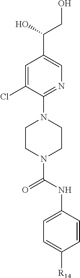 - DKNCTWHRXNUREW-JGKOQLHDSA-N C=S(=O)(C1=CC=C(NC(=O)N2CCC(F)(C3=NC=C([C@@H](O)CO)C=C3Cl)CC2)C=C1)C(F)(F)F.CC1=CC(NC(=O)N2CCC(F)(C3=NC=C([C@H](O)CO)C=C3Cl)CC2)=CC=C1Br.CCC1=CC(NC(=O)N2CCC(F)(C3=NC=C([C@H](O)CO)C=C3F)CC2)=CC=C1C(F)(F)F.COC1=CC(NC(=O)N2CCC(F)(C3=NC=C([C@@H](O)CO)C=C3Cl)CC2)=CC=C1C(F)(F)F.COC1=CC(NC(=O)N2CCC(F)(C3=NC=C([C@@H](O)CO)C=C3F)CC2)=CC=C1C(F)(F)F.O=C(NC1=CC=C(C(F)(F)F)C=C1)N1CCC(F)(C2=NC=C([C@@H](O)CO)C=C2F)CC1 Chemical compound C=S(=O)(C1=CC=C(NC(=O)N2CCC(F)(C3=NC=C([C@@H](O)CO)C=C3Cl)CC2)C=C1)C(F)(F)F.CC1=CC(NC(=O)N2CCC(F)(C3=NC=C([C@H](O)CO)C=C3Cl)CC2)=CC=C1Br.CCC1=CC(NC(=O)N2CCC(F)(C3=NC=C([C@H](O)CO)C=C3F)CC2)=CC=C1C(F)(F)F.COC1=CC(NC(=O)N2CCC(F)(C3=NC=C([C@@H](O)CO)C=C3Cl)CC2)=CC=C1C(F)(F)F.COC1=CC(NC(=O)N2CCC(F)(C3=NC=C([C@@H](O)CO)C=C3F)CC2)=CC=C1C(F)(F)F.O=C(NC1=CC=C(C(F)(F)F)C=C1)N1CCC(F)(C2=NC=C([C@@H](O)CO)C=C2F)CC1 DKNCTWHRXNUREW-JGKOQLHDSA-N 0.000 description 1