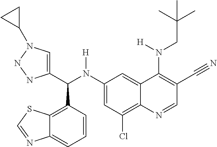 - VFNBKRQDHTXELO-NDEPHWFRSA-N [H]N(CC(C)(C)C)C1=C(C#N)C=NC2=C(Cl)C=C(N([H])[C@H](C3=CN(C4(C(F)(F)F)CC4)NN3)C3=CC=C(F)C4=C3C=CN=C4)C=C21 Chemical compound [H]N(CC(C)(C)C)C1=C(C#N)C=NC2=C(Cl)C=C(N([H])[C@H](C3=CN(C4(C(F)(F)F)CC4)NN3)C3=CC=C(F)C4=C3C=CN=C4)C=C21 VFNBKRQDHTXELO-NDEPHWFRSA-N 0.000 description 2