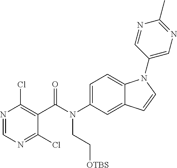 A solution of 4,6-dichloropyrimidine-5-carbonyl chloride (0.824 g, 4.27 mmol) in DCM (20 mL) was added drop-wise to an ice-cold solution of 26F (1.2 g, 2.85 mmol) and triethylamine (1.19 ml, 8.54 mmol) in DCM (25 mL), and the mixture was stirred for 1 h. The reaction was diluted with dichloromethane and washed with water. The separated organic layer was dried over sodium sulphate and filtered, and the filtrate was concentrated in vacuo. The residue was purified by flash chromatography using 20% ethyl acetate in hexane to afford title compound (1.3 g, 77%) as an off white solid. 1H NMR (300 MHz, DMSO-d6): δ 8.74 (s, 1H), 8.51 (d, J=2.7 Hz, 1H), 7.79 (dd, J1=2.7 Hz, J2=8.7 Hz, 1H), 7.62 (d, J=1.8 Hz, 1H), 7.42 (d, J=3.3 Hz, 1H), 7.36 (d, J=8.1 Hz, 1H), 6.85 (d, J=1.2 Hz, 1H), 6.64 (d, J=3.3 Hz, 1H), 3.99 (t, J=5.4 Hz, 2H), 3.78 (t, J=5.7 Hz, 2H), 2.54 (s, 3H), 1.36 (m, 1H), 0.88 (s, 9H), 0.38-0.26 (m, 4H), 0.03 (s, 6H). ESI-MS m/z=597 (M+H)+.