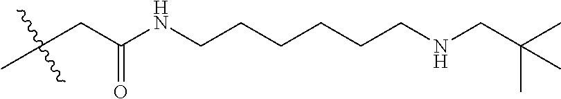 - each occurrence of R4 is independently halogen, hydroxy, aryl (e.g., phenyl), O(CH2)mORA, O(CH2)mO(CH2)mORA, C(═O)(C1-C6)alkyl, C(═O)ORA, C(═O)NRARB, —NRARB, —NRCCH2(CH2)pNRARB, NRC[CH2(CH2)pNRA]mCH2(CH2)nNRARB, O[CH2(CH2)pO]mCH2(CH2)nORA, OCH2(CH2)pNRARB, or O[CH2(CH2)pO]mCH2(CH2)nNRARB;