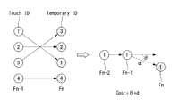 The ID tracking part 54 sets comparison blocks, each including one or more adaptive touch groups contacting or overlapping each other. The ID tracking part 54 then matches temporary IDs of a current frame, which are given to touch points in each respective comparison block, to touch IDs of a previous frame using only the touch points in the same comparison block as comparison objects. The ID tracking part 54 performs one-to-one comparison between each of the touch points represented by the temporary IDs of the current frame and each of the touch points represented by the touch IDs of the previous frame within a given comparison block, and calculates a cost based on an angle and a distance between the temporary ID and the touch ID which are compared with each other. The ID tracking part 54 matches each respective temporary ID with the touch ID resulting in the minimum cost, among all the touch IDs in the comparison block, when compared with that temporary ID. The ID tracking part 54 may then connect touch coordinates of a given user, which may repeatedly change during a plurality of frame periods, to the same touch ID.