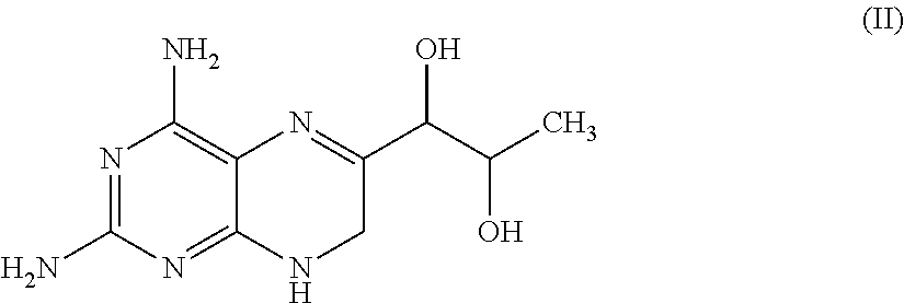 The “therapeutically effective amount” is a dose of the compound of formula (I) and/or the compound of formula (II) that produces the effects for which it is administered. The exact dose will depend on the purpose of the treatment, and will be ascertainable by one skilled in the art using known techniques. As is known in the art and described above, adjustments for systemic versus localized delivery, age, body weight, general health, sex, diet, time of administration, drug interaction and the severity of the condition may be necessary, and will be ascertainable with routine experimentation by those skilled in the art. In this context, it is noted again that both compounds, 4-Amino-5,6,7,8-tetrahydro-L-biopterin and 4-Amino-7,8-dihydro-L-biopterin are pharmaceutically active. It is also noted that 4-Amino-7,8-dihydro-L-biopterin can be obtained by oxidation (also spontaneous oxidation) from 4-Amino-5,6,7,8-tetrahydro-L-biopterin. Thus, a composition of the invention can comprise either only 4-Amino-5,6,7,8-tetrahydro-L-biopterin or 4-Amino-7,8-dihydro-L-biopterin or mixture of these two compounds in any ratio.