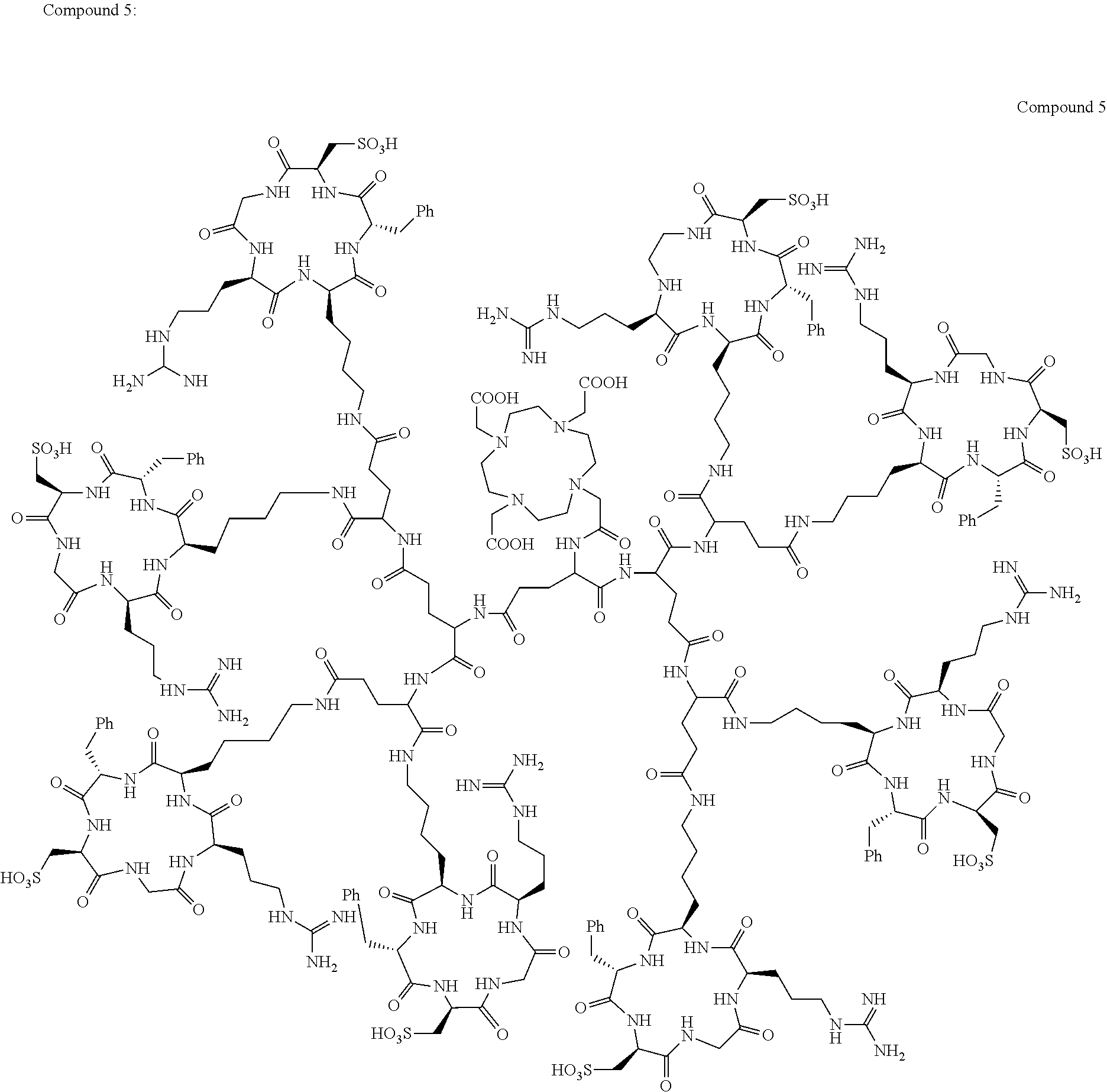 In addition, in an important and useful application, a dimeric RGD peptide-drug conjugate has been shown to be useful for integrin-targeted drug delivery for tumor targeting (see Chen et al., J. Med. Chem., (2005) 48(4): 1098-1106).