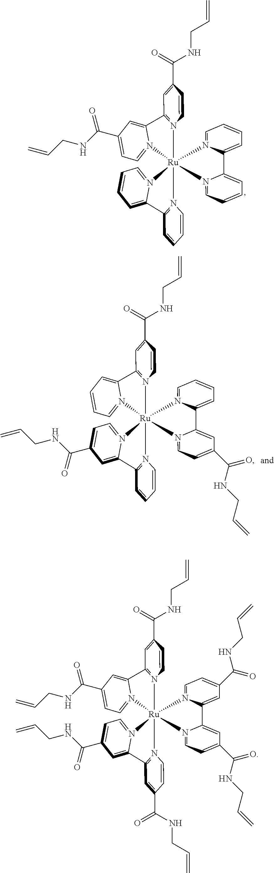 [Ru(bipy)3]n+ is as a well-known coordination compound (Balzani et al., Chem. Rev., 96:759-833 (1996); Crosby et al., J. Chem. Phys., 43:1498 (1965); Caspar et al., J. Am. Chem. Soc., 105:5583-5590 (1983); Maness et al., J. Am. Chem. Soc., 118:10609-10616 (1996)) and has long lifetime of excited state that has both oxidizing and reducing properties. Its derivatives have served as photosensitizers (Demas et al., J. Am. Chem. Soc., 93:1800 et seq. (1971); Meyer, Accounts Chem. Res., 22:163-170 (1989); Kalyanasundaram et al., Coord. Chem. Rev., 177:347-414 (1998)), electrochemiluminescent components (Tokel et al., J. Am. Chem. Soc., 94:2862 et seq. (1972)), the core of a bacteria sensing element (Grunstein et al., J. Am. Chem. Soc., 133:13957-13966 (2011)), a component for conducting polymers (Zhu et al., J. Mater. Chem., 9:2123-2131 (1999)), and the cores of star polymers (Lamba et al., J. Am. Chem. Soc., 119:1801-1802 (1997); Collins et al., Macromolecules, 31:6715-6717 (1998); McAlvin et al., Macromolecules, 32:6925-6932 (1999)).