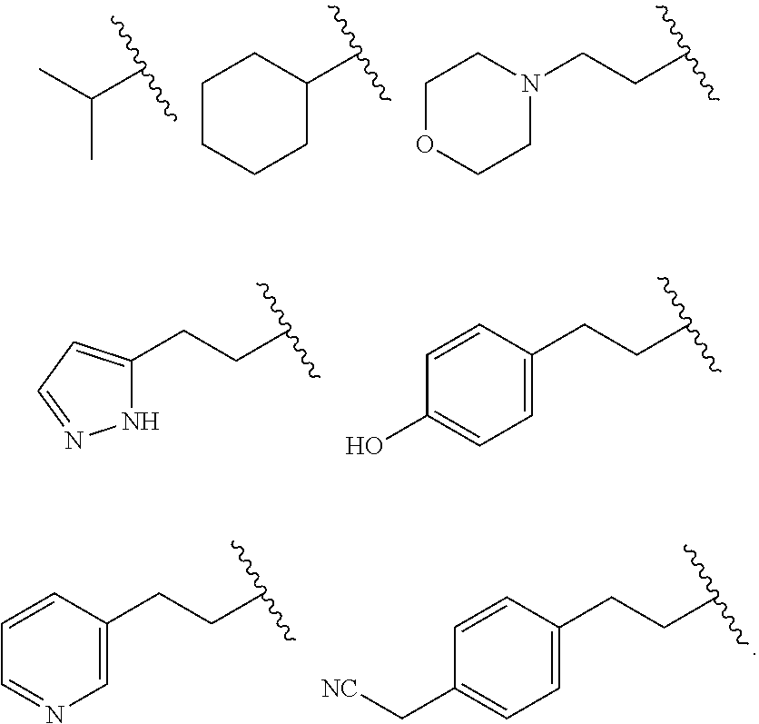 R4 is selected from an alkyl, a substituted alkyl, an aralkyl, a substituted aralkyl, an aryl, a substituted aryl, an alkyl-cycloalkyl, a substituted alkyl-cyclohexyl, a cycloalkyl, a substituted cycloalkyl, an alkyl-heterocycle, a substituted alkyl-heterocycle, a heterocycle, a substituted heterocycle, an amino, a substituted amino, an alkoxy and a substituted alkoxy; and