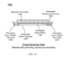 FIG. 19 illustrates a module (similar to the one shown in FIG. 15, but with an additional filter tile 1950) assembled on a top surface of a system PCB 1960 with a cavity and electrically connected to the system PCB 1960 via protruding input/output terminals 1930, in accordance with some example embodiments. In FIG. 19, the module is placed inside a cavity formed in a system PCB 1960 for saving vertical space. Windings 1912 inside the magnetic core are used to form magnetic components. The addition of filter tile 1950 illustrates the concept to mix and match various available components for optimizing and tailoring the module to specific needs.