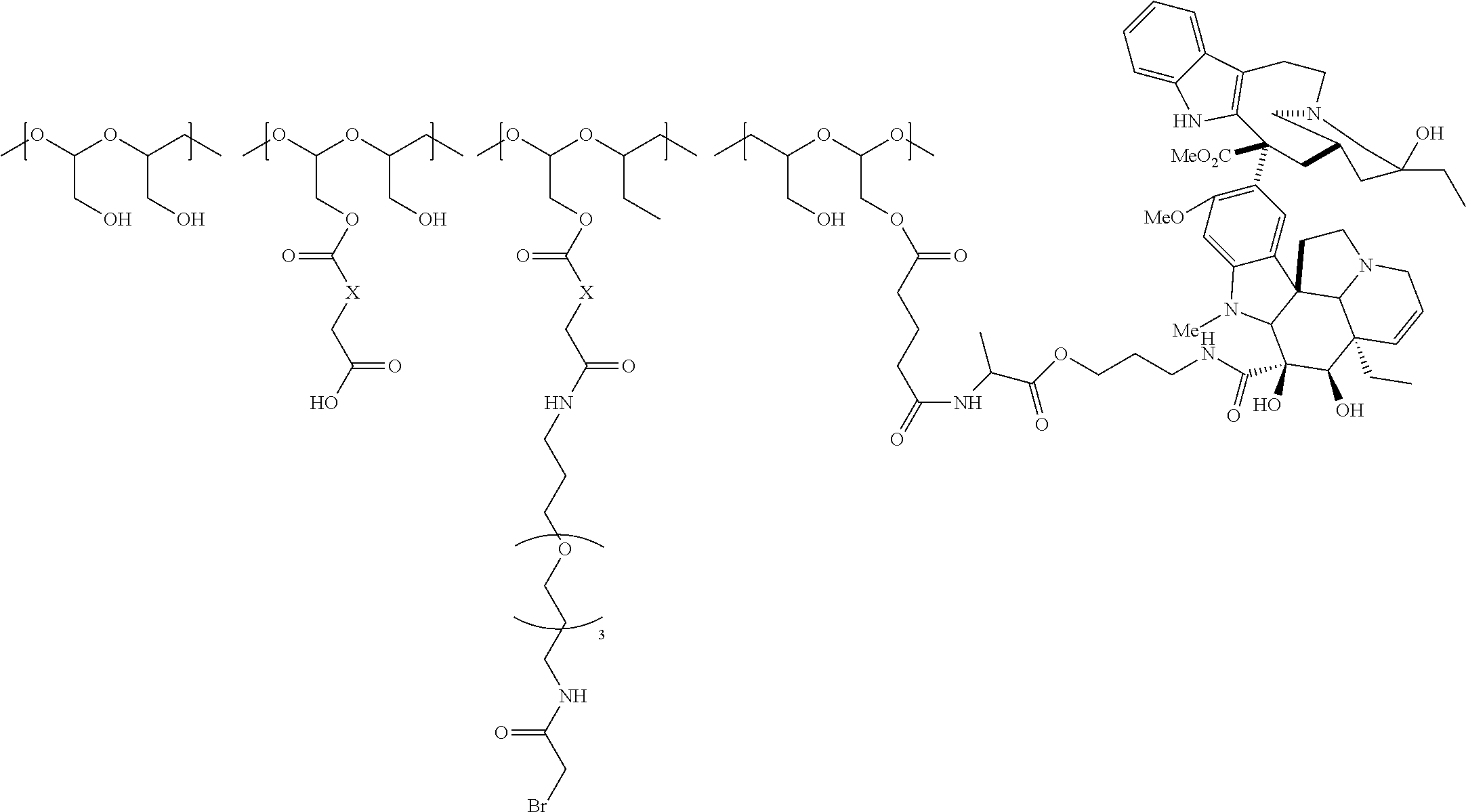 FIG. 3 provides the results for the tumor response in mice inoculated subcutaneously with BT474 tumors (n=12 for each group) after IV administration of vehicle; PBRM (trastuzumab) at 15 mg/kg; PBRM-drug polymer conjugates PHF-GA-(Auristatin F-hydroxypropylamide-L-Alanine)-(Trastuzumab-MCC) (Example 52, Auristatin F:Trastuzumab about 20:1 to 22:1) at 7.5 mg/kg; drug polymer conjugate PHF-GA-SH-(Auristatin F-propylamide-L-Alanine) (Example 51) (dosed at an auristatin dose that was equivalent to that present in Example 52 at 15 mg/kg) in combination with trastuzumab at 15 mg/kg dosed once every week for 3 weeks on day 1, day 8 and day 15 respectively. The results show reduction of tumor volume for Example 52 with 100% complete responses (11/11) and 100% tumor free survival (11/11). The vehicle, trastuzumab alone, combination of Example 51 and trastuzumab all showed an increase of tumor volume. The conjugation of PBRM to drug-polymer conjugate was necessary for the reduction of tumor volume as neither a drug-polymer conjugate in combination with a PBRM (Example 51 in combination with trastuzumab) nor PBRM (trastuzumab) alone showed reduction in tumor volume.