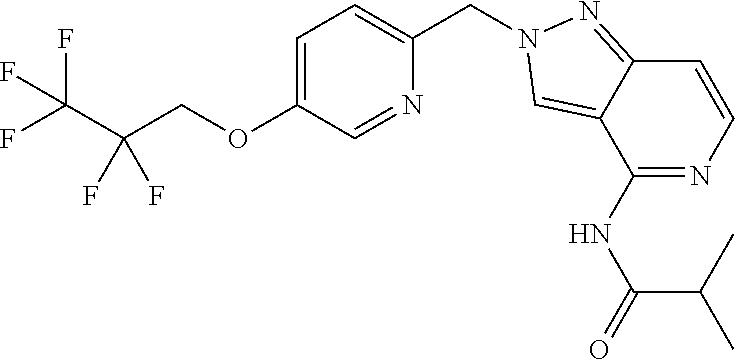 Human HERG transfected HEK293S cells are prepared and grown in-house. The collected cells are suspended in 50 mM Tris-HCl (pH 7.4 at 4° C.) and homogenized using a hand held Polytron PT 1200 disruptor set at full power for 20 sec on ice. The homogenates are centri-fuged at 48,000×g at 4° C. for 20 min. The pellets are then resuspended, homogenized, and centrifuged once more in the same manner. The final pellets are resuspended in an appropriate volume of 50 mM Tris-HCl, 10 mM KCl, 1 mM MgCl2 (pH 7.4 at 4° C.), homogenized, ali-quoted and stored at −80° C. until use. An aliquot of membrane fractions is used for protein concentration determination using BCA protein assay kit (PIERCE) and ARVOsx plate reader (Wallac). Binding assays are conducted in a total volume of 30 microL in 384-well plates. The activity is measured by PHERAstar (BMG LABTECH) using fluorescence polarization technology. Ten microL of test compounds are incubated with 10 microL of fluorescence ligand (6 nM Cy3B tagged dofetilide derivative) and 10 microL of membrane homogenate (6 microgram protein) for 120 minutes at room temperature. Nonspecific binding is determined by 10 microM E4031 at the final concentration.