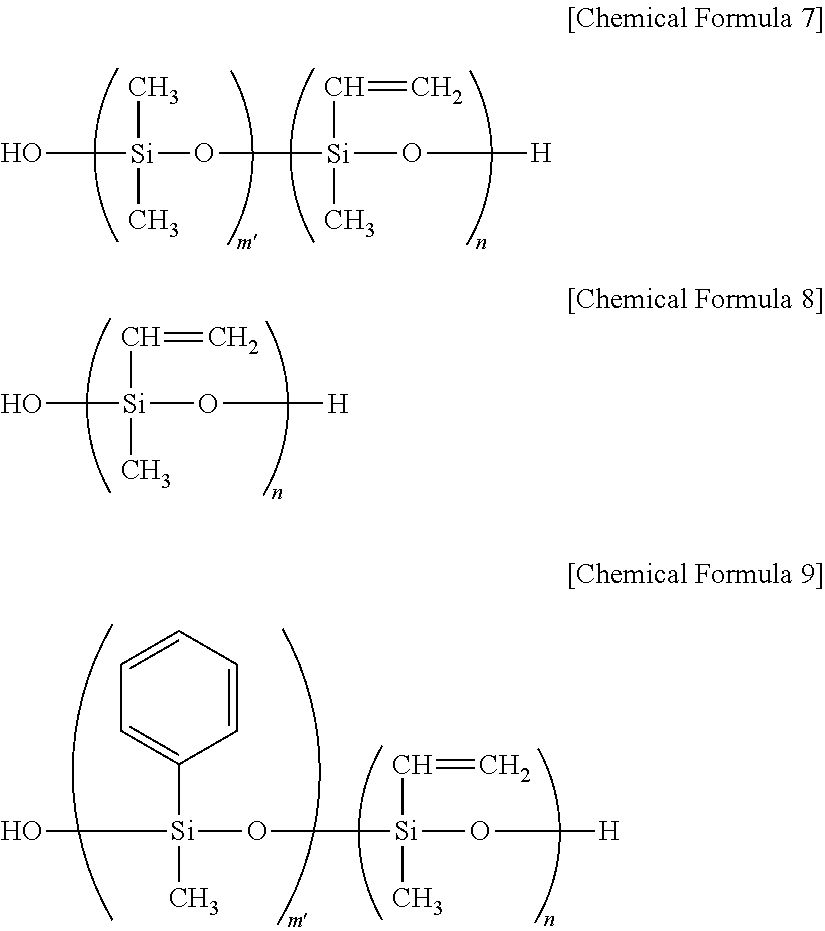 Component (A-5): a dimethylpolysiloxane capped at both molecular terminals with dimethylvinylsiloxy groups (vinyl group content=0.15 mass %), having a viscosity of 10,000 mPa·s, and represented by the following average formula: