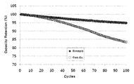 - FIG. 1 is a graph showing capacity retention (%) of batteries prepared in the Example and the Comparative Examples of the present disclosure.