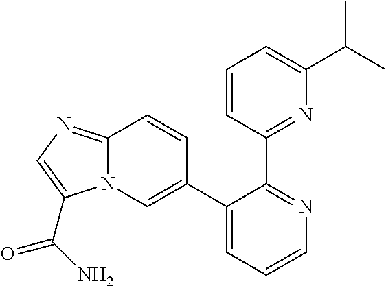 - HJSBGWUOAXOQJX-UHFFFAOYSA-N CC1=CC(C2=NC=CC=C2C2=CN3C(C(N)=O)=CN=C3C=C2)=NC(C)=C1 Chemical compound CC1=CC(C2=NC=CC=C2C2=CN3C(C(N)=O)=CN=C3C=C2)=NC(C)=C1 HJSBGWUOAXOQJX-UHFFFAOYSA-N 0.000 description 3