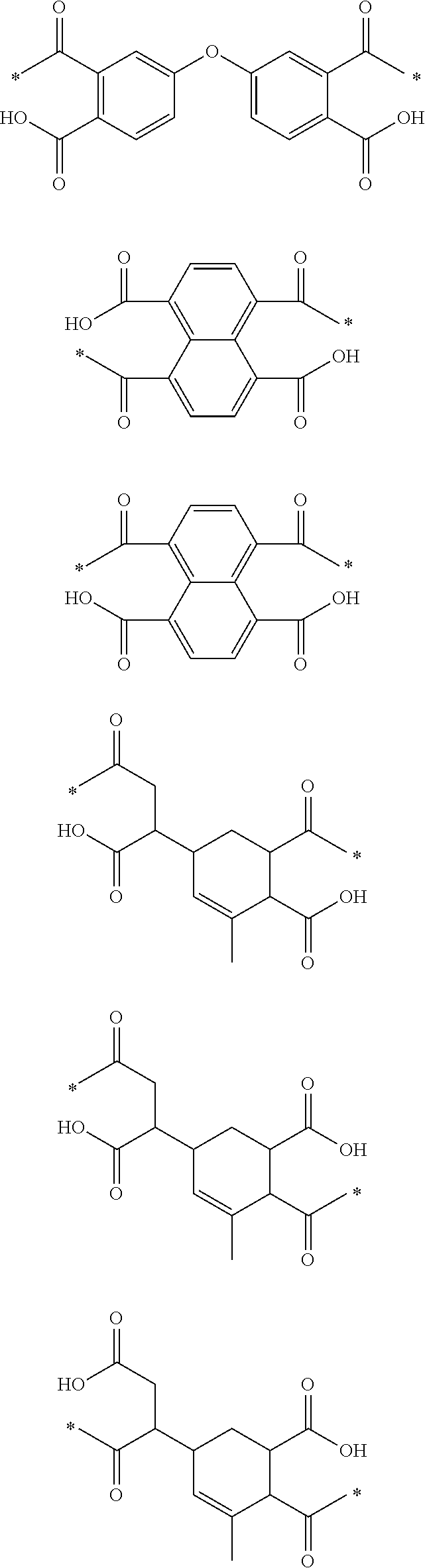 Examples of aromatic tetracarboxylic acid anhydrides are pyromellitic acid dianhydride, ethylene glycol dianhydrous trimellitic acid ester, propylene glycol dianhydrous trimellitic acid ester, butylene glycol dianhydrous trimellitic acid ester, 3,3′,4,4′-benzophenonetetracarboxlic acid dianhydride, 2,2′,3,3′-benzophenonetetracarboxylic acid dianhydride, 3,3′,4,4′-biphenylsulfonetetracarboxylic acid dianhydride, 2,2′,3,3′-biphenylsulfonetetracarboxylic acid dianhydride, 1,4,5,8-naphthalenetetracarboxylic acid dianhydride, 2,3,6,7-naphthalenetetracarboxylic acid dianhydride, 3,3′,4,4′-biphenylethertetracarboxylic acid dianhydride, 3,3′,4,4′-dimethyldiphenylsilane tetracarboxylic acid dianhydride, 3,3′,4,4′-tetraphenylsilane tetracarboxylic acid dianhydride, 1,2,3,4-furanetetracarboxylic acid dianhydride, 4,4′-bis(3,4-dicarboxyphenoxy)diphenylsulfide dianhydride, 4,4′-bis(3,4-dicarboxyphenoxy)diphenylsulfone dianhydride, 4,4′-bis(3,4-dicarboxyphenoxy)diphenylpropane dianhydride, 3,3′,4,4′-perfluoroisopropylidenediphthalic acid dianhydride, 3,3′,4,4′-biphenyltetracarboxylic acid dianhydride, bis(phthalic acid)phenylphosphineoxide dianhydride, p-phenylene-bis(triphenylphthalic acid)dianhydride, M-phenylene-bis(triphenylphthalic acid)dianhydride, bis(triphenylphthalic acid)-4,4′-diphenyl ether dianhydride, bis(triphenylphthalic acid)-4,4′-diphenylmethane dianhydride, 9,9-bis(3,4-dicarboxyphenyl)fluorene dianhydride, and 9,9-bis[4-(3,4-dicarboxyphenoxy)phenyl]fluorene dianhydride.