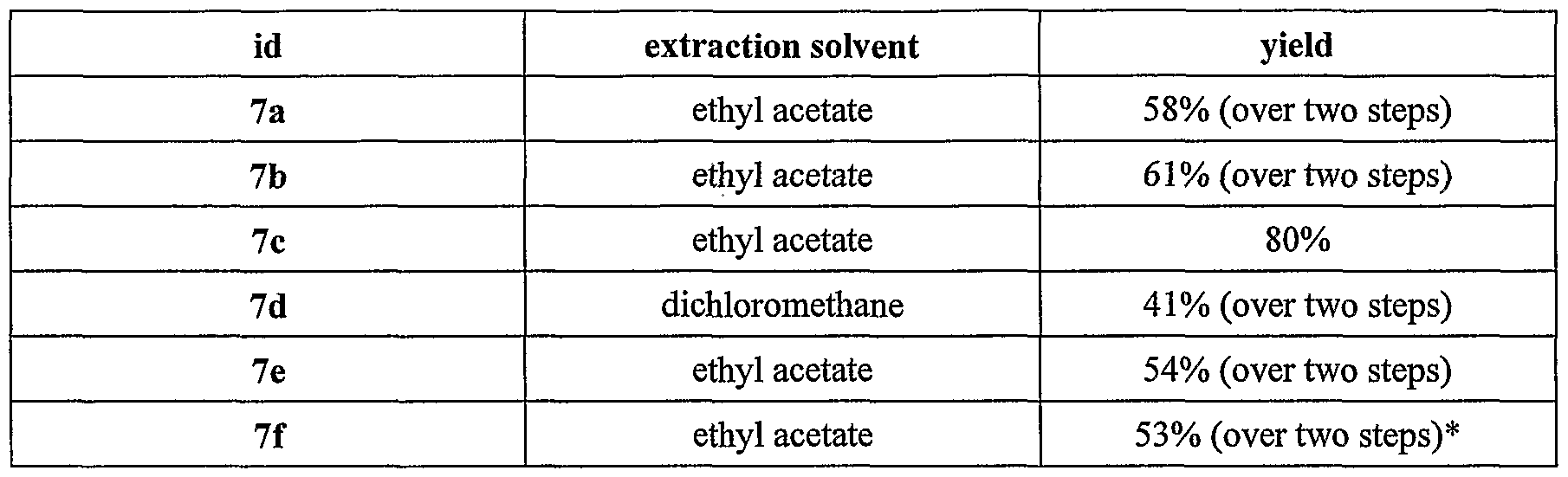 Compound (6a-e) (13mmol) was dissolved in THF (35 mL) and water (23 mL) and cooled to 0°C. A solution of sodium hydroxide (1.04g, 26mmol, 2 equiv.) in water (20 mL) was added dropwise with stirring. The reaction was monitored by tic analysis and when complete (typically 2 h) the reaction mixture was diluted with brine (30 mL) and washed with ether (100 mL). The reaction mixture was acidified using 20% citric acid solution. The acidic mixture was then extracted with a suitable organic solvent (dichloromethane or ethyl acetate) and when fully extracted the organic extracts were combined, dried over MgSO , filtered and concentrated in vacuo to yield essentially pure product.
