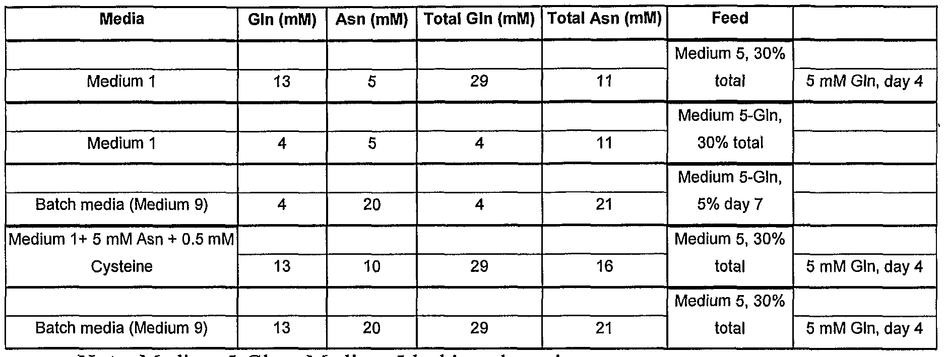 - the present invention provides commercial scale (e.g., 500 L or more) culture methods that utilize a medium characterized by one or more of: i) a cumulative amino acid amount per unit volume greater than about 70 mM; ii) a molar cumulative glutamine to cumulative asparagine ratio of less than about 2; iii) a molar cumulative glutamine to cumulative total amino acid ratio of less than about 0.2; iv) a molar cumulative inorganic ion to cumulative total amino acid ratio between about 0.4 to 1; or v) a combined cumulative amount of glutamine and asparagine concentration per unit volume greater than about 16 mM.